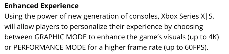 “Using the power of [the] new generation of consoles, [Xbox Series X/S and PS5] will allow players to personalize their experience by choosing between Graphic Mode to enhance the game’s visuals (up to 4K) or Performance Mode for a higher frame rate (up to 60 FPS),” the GameStop listing reads.