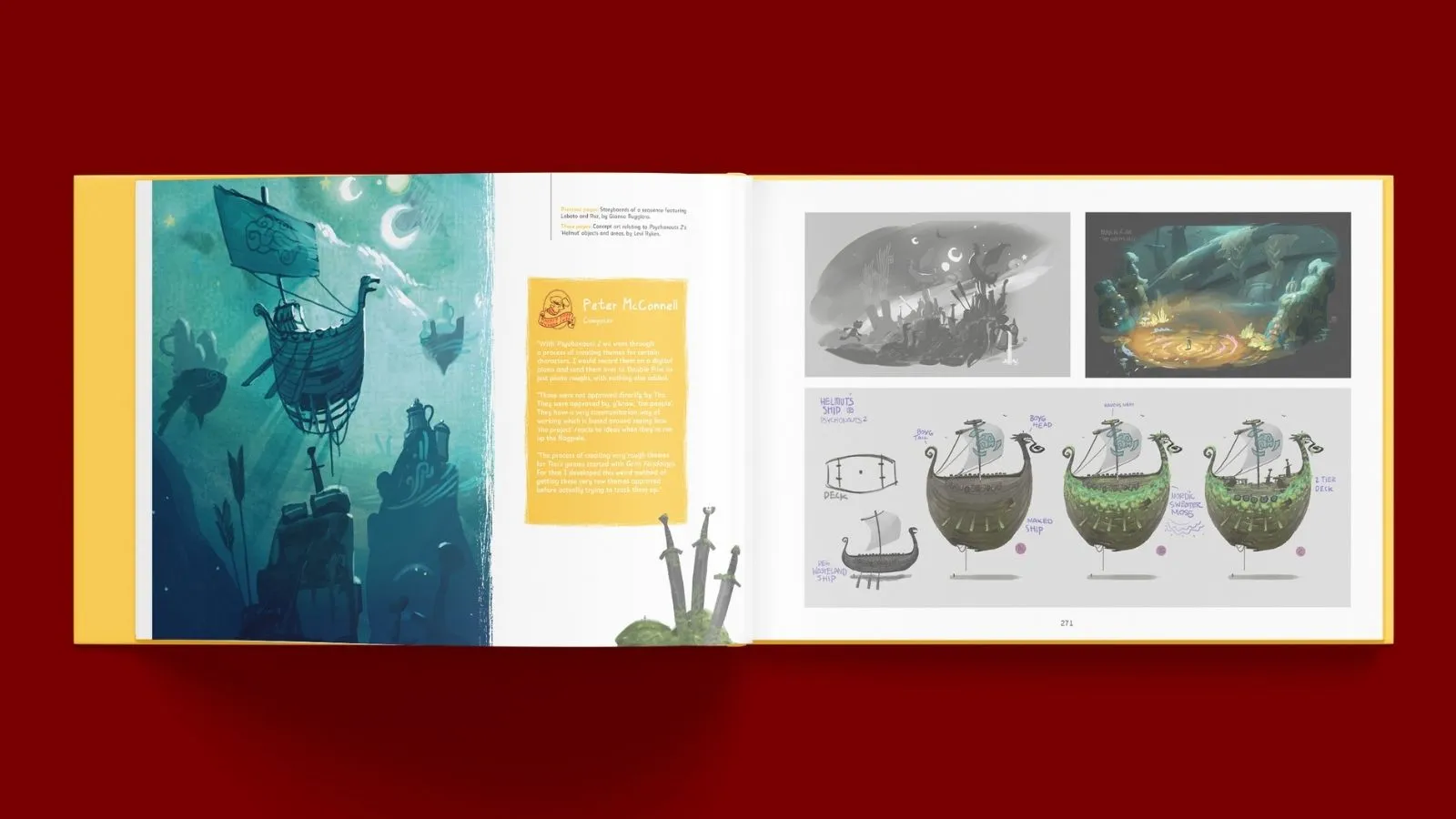 Read down below for an exclusive excerpt from the book, titled 20 Double Fine Years, giving a brief look at the design decisions behind Psychonauts 2's Aquato family and the game's many, many brains. We've also collected a handful of pages so you can see how the entire book is laid out.
