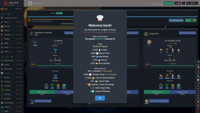 Runescape. Remember chopping trees and banging on rocks until your mouse broke? Imagine doing all that again but without actually having to move around a game world. Fish, chop trees, mine rocks, and slay dangerous monsters in Melvor Idle, which serves up a big RPG fantasy world in an idle package. You're probably saying to yourself, "okay, but I can watch bars and numbers go up in any idle game – why Melvor?" Melvor has a ton of depth if you're looking for it! Sure, you can set it and forget it and do whatever for hours and come back to a large resource yield, or you can play more actively, taking on unique monsters in real-time combat and exploring dungeons for rare drops.