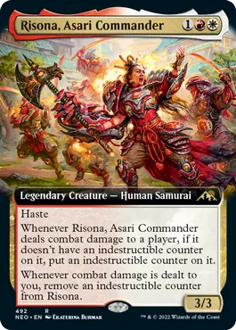 Let me introduce you properly to Risona, Asari Commander. She’s a legendary Human Samurai creature in the Boros/Lorehold colors that costs 1RW to cast. Bringing a solid three power and three toughness and Haste to the board, Risona is bringing a decent body for her cost, ready to rush in for an attack. Where Risona makes her mark is her rules text which says, “Whenever Risona, Asari Commander deals combat damage to a player, if it doesn’t have an indestructible counter on it, put an indestructible counter on it. Whenever combat damage is dealt to you, remove an indestructible counter from Risona.” That second clause is key to keeping Risona alive. Make sure you're board is prepared to defend so Risona can remain to slay safely.