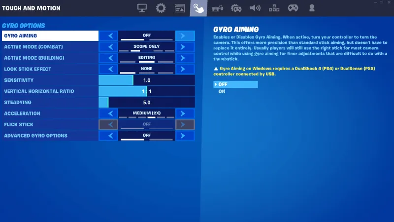 “Enable or disable gyro controls in the ‘Touch and Motion’ tab of the settings,” an Epic Games blog post reads. “Do this by toggling ‘Gyro Aiming’ to either on or off. When on, you’ll be able to control the camera by turning the controller. This offers more precision than standard stick aiming, but it doesn’t have to replace it entirely. Usually, players will still use the right stick for most camera control while using gyro aiming for finer adjustments that are difficult to do with a thumbstick.”