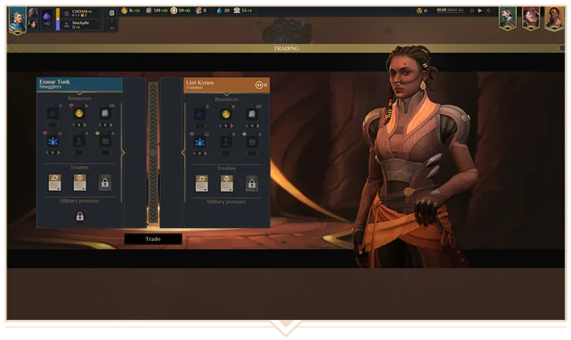 As for the addition of the Fremen to Spice Wars, this marks the first time the now Arrakis-natives will be a main playable faction in any Dune strategy game to date. The Fremen are led by Liet Kynes, who holds dueling allegiances to her people and to the emperor as a planetologist. Her faction interacts with the harsh deserts of Arrakis more favorably than the feuding houses and smugglers they will contend against. The Fremen can move through the sands further before succumbing to exhaustion or attracting massive sandworms. They specialize in stealth and guerilla tactics and can make use of and ally with neutral territories.