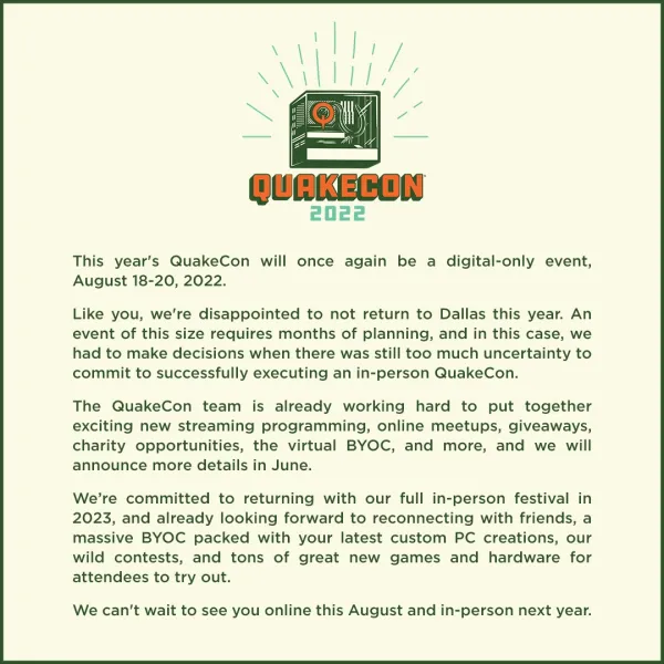 Quakecon was a digital event in 2020 and 2021, with last year’s show being free to attend. This news isn't far removed from E3 2022's outright cancellation last month due to similar concerns, though this month's PAX East has committed to being a physical convention. Every company has their own comfort-level for dealing with the pandemic and while the situation has improved, we likely won't see every event back in full from until at least 2023 and maybe beyond.