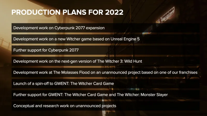 The first few items on the 2022 to-do list are things we already know. A Cyberpunk 2077 expansion is in the works and will be in development this year, but it won't see the bright lights of Night City until it releases in 2023, as was announced on the CDPR Twitter account and in this same earnings call. Also, the Witcher series is getting a new entry and a new engine in Unreal 5, and the studio will continue to work on improving Cyberpunk – no surprises there. CDPR had already announced this week that it would be taking on the development of the new-generation upgrade of The Witcher 3: Wild Hunt, taking collaborator Saber Interactive off the porting job.