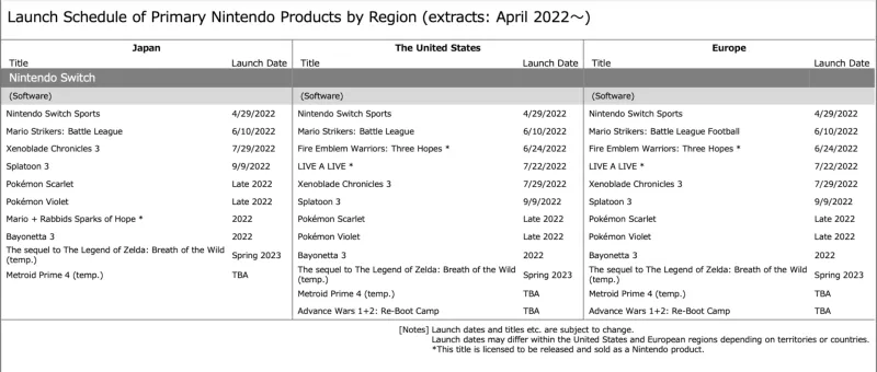 Other 2022 releases Nintendo expects to actually hit this year include Mario Strikers: Battle League (June 10), Xenoblade Chronicles 3 (July 29), Splatoon 3 (September 9), and more. It even lists Pokemon Scarlet and Pokemon Violet as “Late 2022” releases, which sounds like it is lining up Generation 9 to hit in the usual holiday – see: November – release window. However, the chart above also lists Advance Wars 1+2: Re-Boot Camp as TBA.