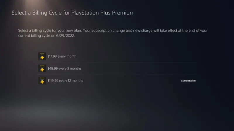 Selecting Change Plan will give you the three tiers of PlayStation Plus to choose from. Picking any of them will bring you to another screen that will finally allow you to choose the length of subscription you'd like to pay for on a recurring basis.