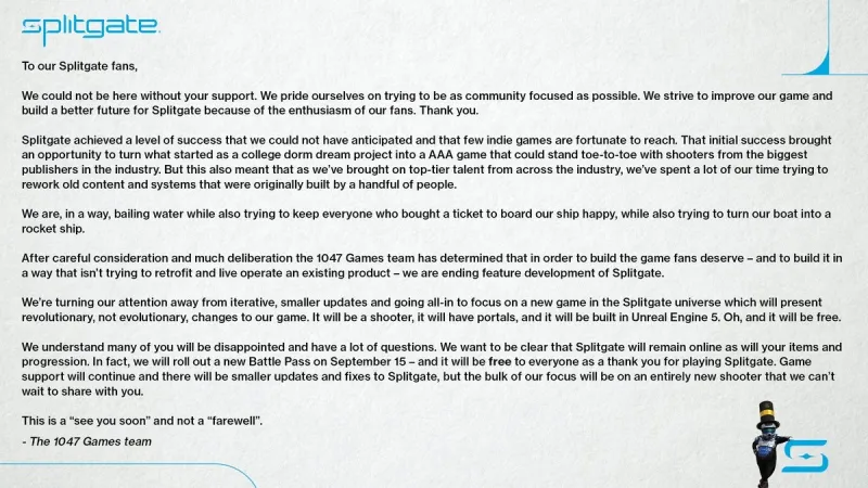 Fans of Splitgate, the sci-fi multiplayer shooter with portals, received some bittersweet news today. Developer 1047 Games has announced it’s finally bringing the game out of its lengthy beta and launching it in 1.0 next month. It also revealed plans to create another title within the Splitgate universe. But to facilitate work on this next project, it will cease feature development of Splitgate.