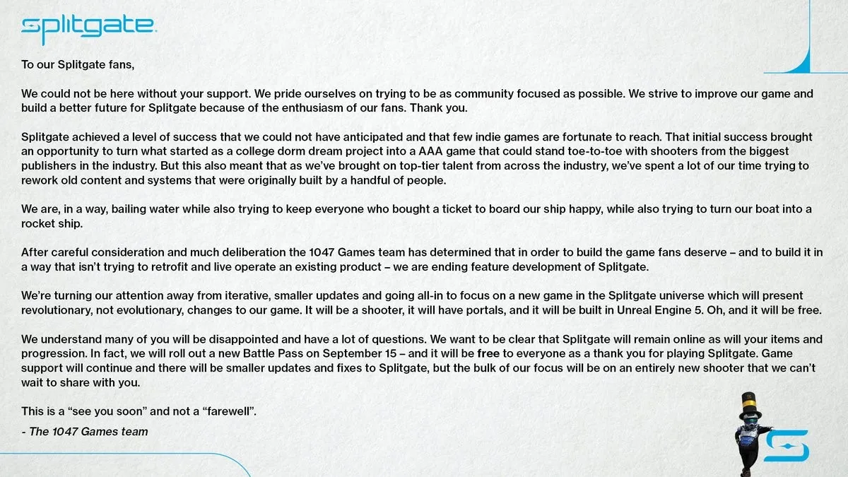 1047 explains in a press release that it’s developing a new shooter in Unreal Engine 5 set in the world of Splitgate, which means it will also feature portals. There aren't any more details beyond this, but it will be the team’s full-time project going forward.