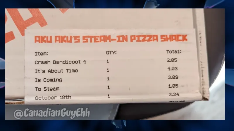 The publisher sent a special Crash-themed pizza box (from "Aku Aku's Steam-In Pizza Shack") to influencers, such as YouTuber Candian Guy Eh. His unboxing video shows that the box is taped with a not-so-subtle message that Crash 4 heads to Steam on October 18. The game, which launched in 2020, is currently playable on PC only through Battle.net.