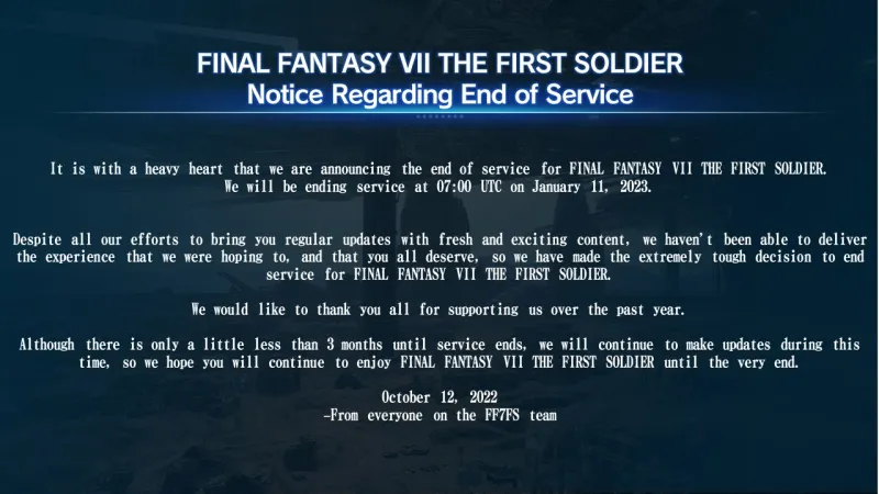 Final Fantasy VII The First Soldier, the mobile multiplayer battle royale, is being shut down in January. The news comes a month shy of the game's one-year anniversary, having launched for iOS and Android in November 2021.
