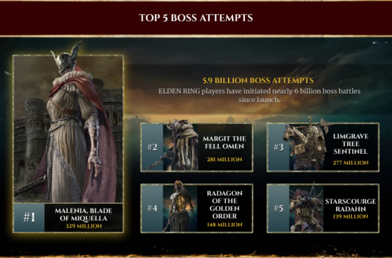 Starting with the least surprising statistic, players have attempted to defeat Malenia, Blade of Miquella, a colossal 329 million times. In second place, players have attempted to beat Margit the Fell Omen 281 million times. In third, Limgrave Tree Sentinel 277 million times, Radagon of the Golden Order in fourth at 148 million, and in fifth, Starscourge Radahn at 139 million. Across all bosses in Elden Ring, players have initiated 5.9 billion attempts.