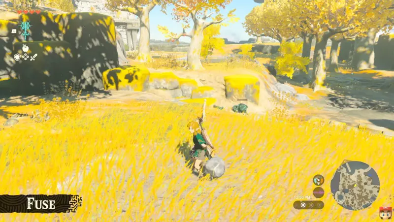 After fighting an enemy up here, we learn that weapon durability, a hotly debated feature of The Legend of Zelda: Breath of the Wild, is back. But now, you can use Link's new "Fuse" ability to create brand-new weapons. Aonuma showed us how to fuse a branch with a boulder to create a giant hammer, promising that you can do all sorts of things with this new ability. You can even fuse two weapons together, and fuse ingredients to arrows to create variations such as homing arrows and more.