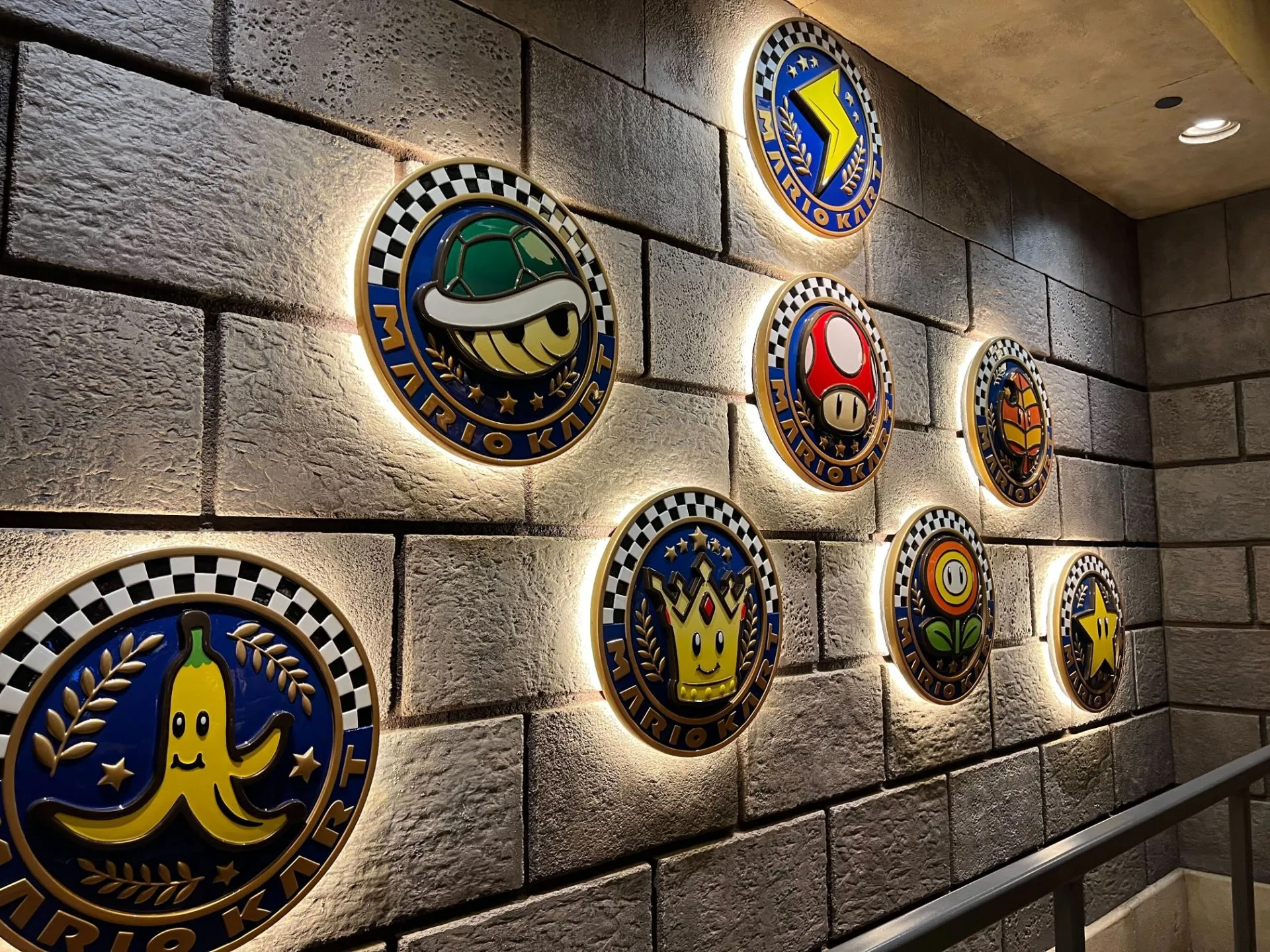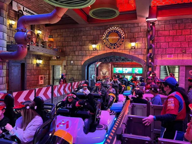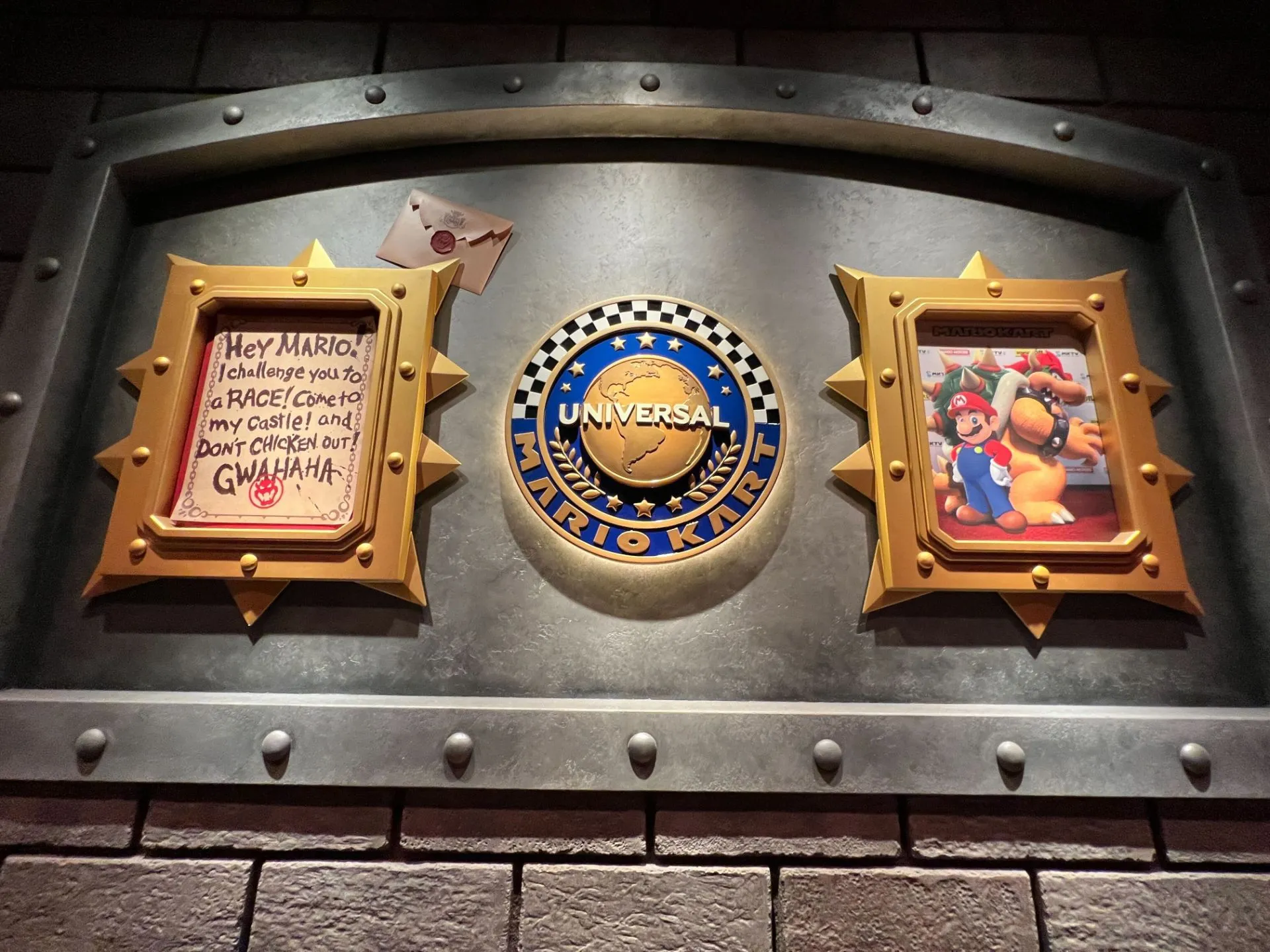 The star of Super Nintendo World is undoubtedly Mario Kart: Bowser's Challenge. The line serpentines through a Yoshi's Island-themed queueing area before eventually having you enter Bowser's Castle. The line is full of fun details and amazing photo opps. After a brief video explaining how the ride/game works, you're led down into the basement of Bowser's Castle, where the Mario Kart race occurs. You're given a Mario visor that will be used to hold the AR visor found on the kart you're about to get in.