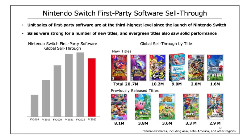 Nintendo says Fiscal Year 2023 was the third-highest level of worldwide sell-through for its software since the Switch's launch. Digital sales of its software are up 12.7%, accounting for 48.2% of its total software sales.