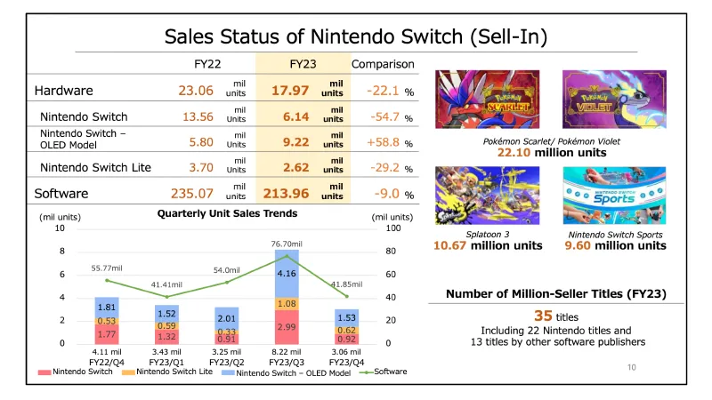 On the software side of things, there were 213.96 million units sold, which is a 9% decrease compared to the previous fiscal year. Nintendo says while new releases like Pokemon Scarlet and Violet, Splatoon 3, and Nintendo Switch Sports helped buoy its software numbers, it likely saw a decrease in overall software sales due to its decline in hardware unit sales.