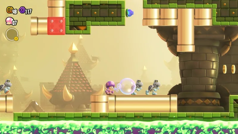 The game starts when Prince Florian, ruler of the Flower Kingdom, has his castle stolen by Bowser. After fusing with a Wonder Flower, the king of the Koopas is able to fly over this new land, populating it with his chaotic cronies. As always, it's up to Mario and friends to save the day, but this time around, he's got more buddies than usual. In addition to Luigi, Peach, and a pair of Toads, Toadette and Daisy are also along for the ride. Unlike some past games, each character here plays the same, meaning Peach has no built-in floating ability and Luigi jumps just as high as Mario.