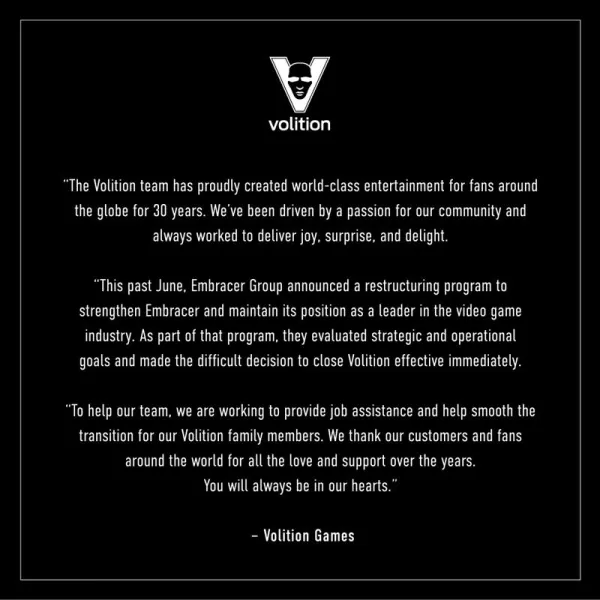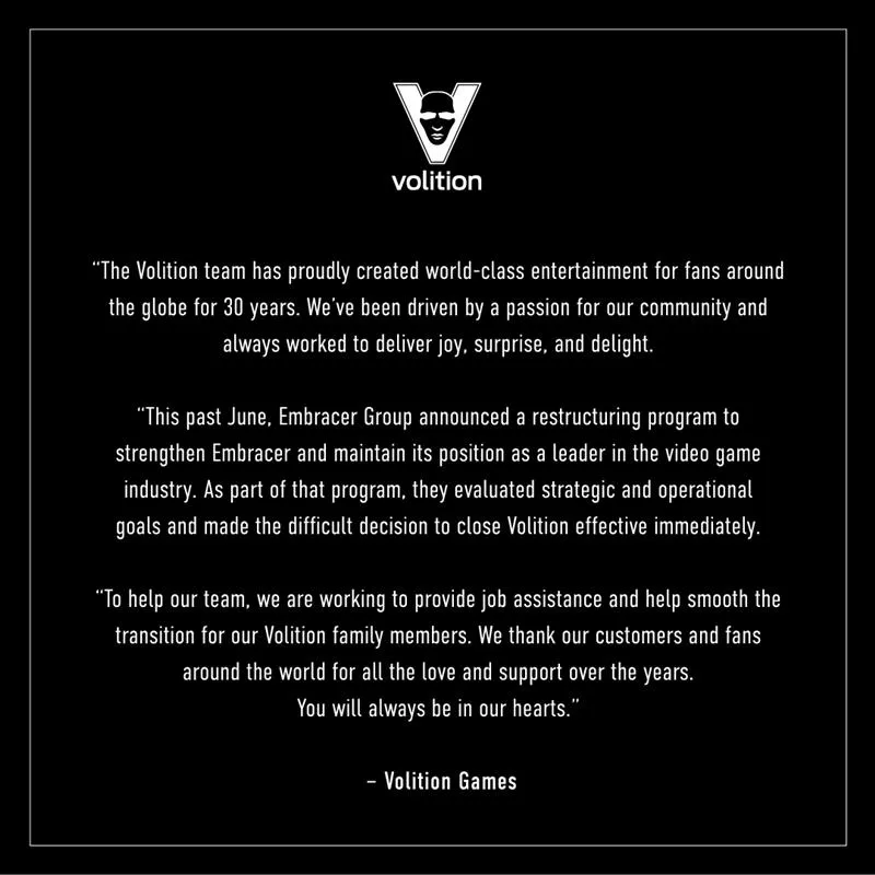 To help our team, we are working to provide job assistance and help smooth the transition for our Volition family members. We thank our customers and fans around the world for all the love and support over the years. You will always be in our hearts.”