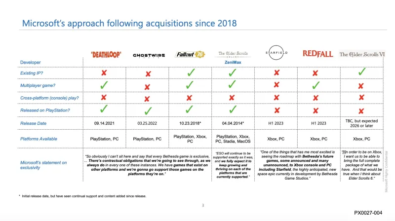 Per The Verge, as a part of the ongoing FTC vs. Microsoft case over the latter’s acquisition of Activision Blizzard, Microsoft released a document to the court featuring a chart illustrating its approach to releasing Bethesda games since purchasing the publisher. It lists each title released under the Microsoft banner with details such as its release window and targeted platforms.
