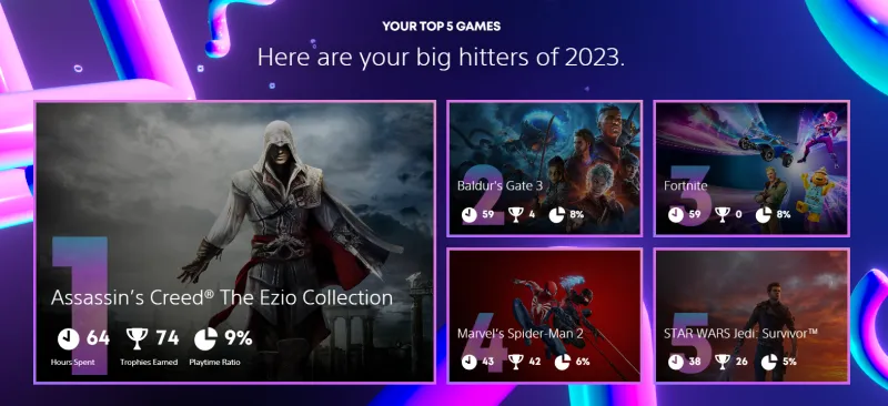 Those who participate will get a quick tour through their 2023 on PlayStation, including their total hours played, their top games, and even which controller they used most often. You can see some of my stats below – including how much time I spent revisiting Ezio's games for an Assassin's Creed retrospective earlier this year.