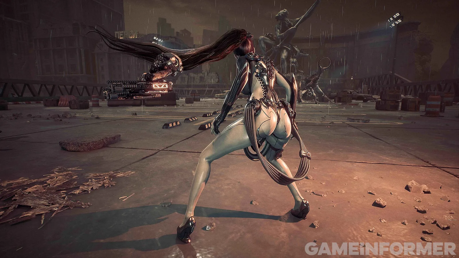 Stellar Blade’s combat is flashy in all gameplay footage to date, with Eve pulling off pre-determined moves and throwing the titular Stellar Blade into the air while her long hair twirls around the action, but those impressive animations don’t explain what players are doing moment-to-moment. Eve can learn various combos, but it’s not the kind of action game where you are memorizing a series of useful inputs and trying to execute the right ones at the right moments. Every encounter begins with the decision of going in offensively or defensively. Enemies will not wait for Eve to make a move, and she can defend, parry, or use evasive maneuvers. Countering enemies will put them in a groggy state, which opens the window to use combos or “Beta Skills,” as Kim and Lee refer to them. “There is also what’s called the Balance Gauge, and if you succeed in consecutive parrying, you can deal a huge blow to the enemies,” Kim says. “Other combat options include assassination, ranged attacks, and more, depending on the situation.”