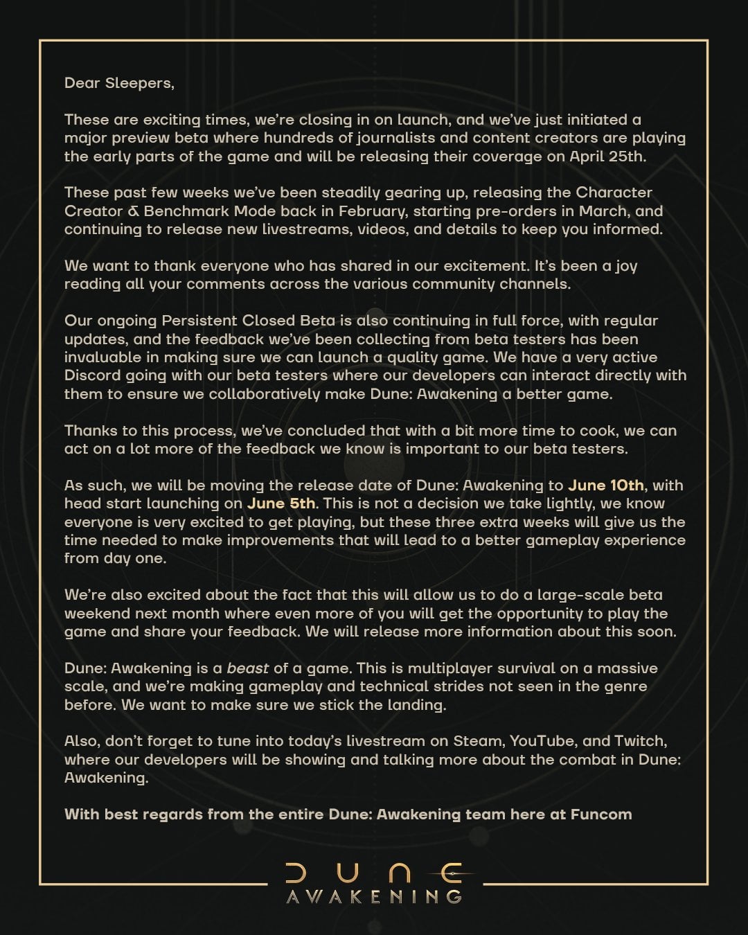 “Dune: Awakening is a beast of a game,” says Funcom in a statement. “This is multiplayer survival on a massive scale, and we’re making gameplay and technical strides not seen in the genre before. We want to make sure we stick the landing.”