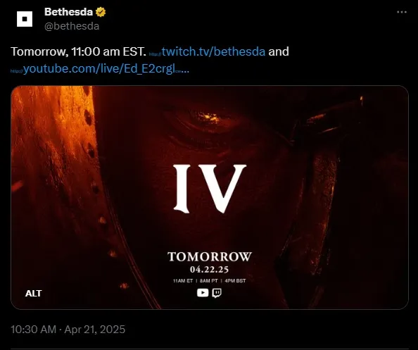 Bethesda took to its accounts on social media sites like Instagram and Twitter to share an image with the Elder Scrolls IV: Oblivion font with only "IV" displayed and an armored mask in the background. The tweet says, "Tomorrow, 11:00 am EST" and lists URLs to the Bethesda Twitch and YouTube channels. When you visit the YouTube channel, you are greeted by the same art, with a livestream that has the title, "All will be revealed...."