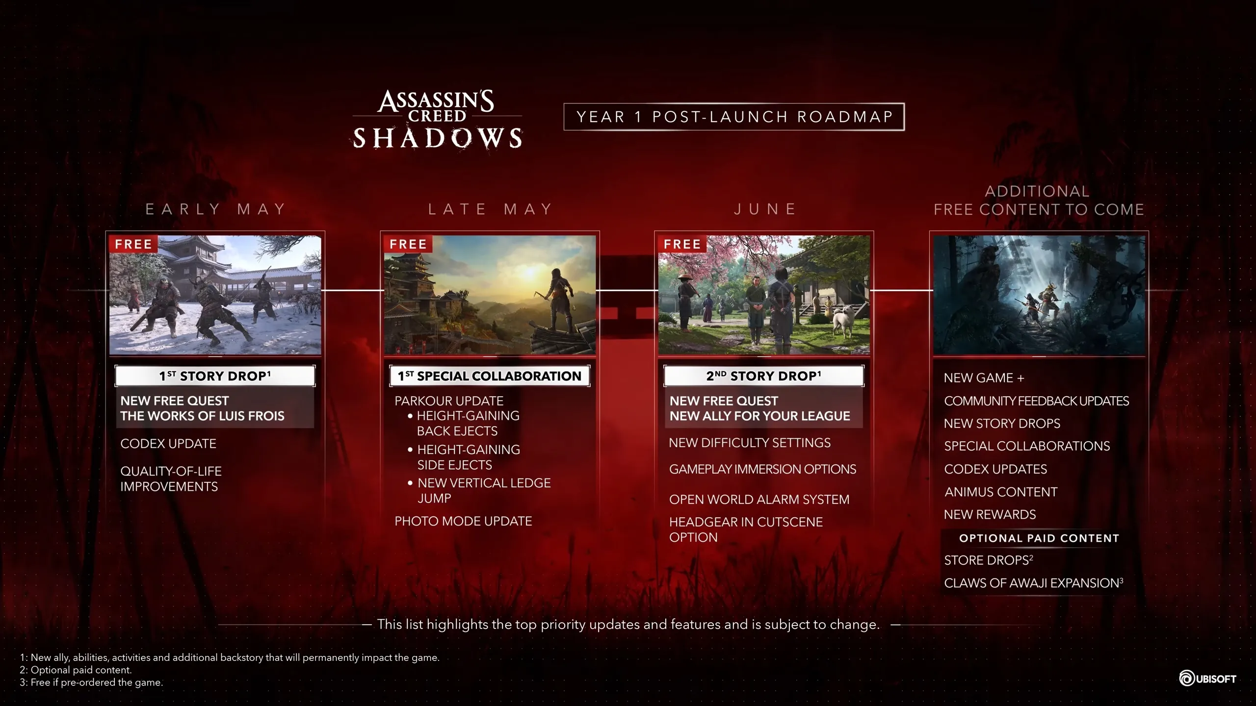 Ubisoft has laid out its Year 1 content roadmap for Assassin’s Creed Shadows. The open-world title will be treated to new story content, parkour improvements, quality-of-life and accessibility updates, and more over the next several months.