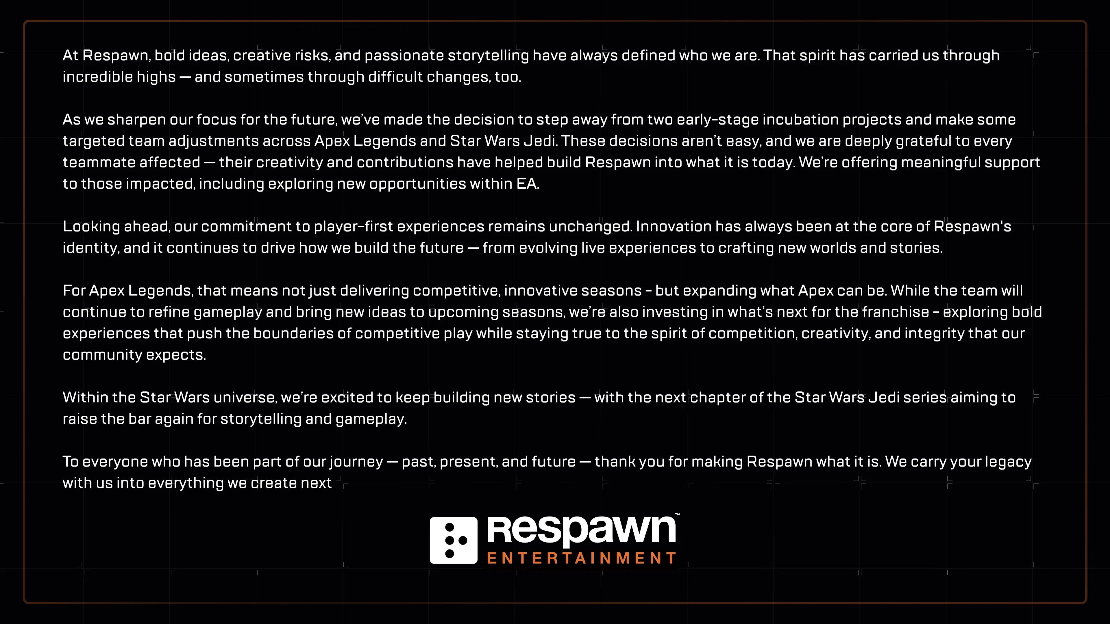"These decisions aren’t easy, and we are deeply grateful to every teammate affected – their creativity and contributions have helped build Respawn into what it is today. We’re offering meaningful support to those impacted, including exploring new opportunities within EA."