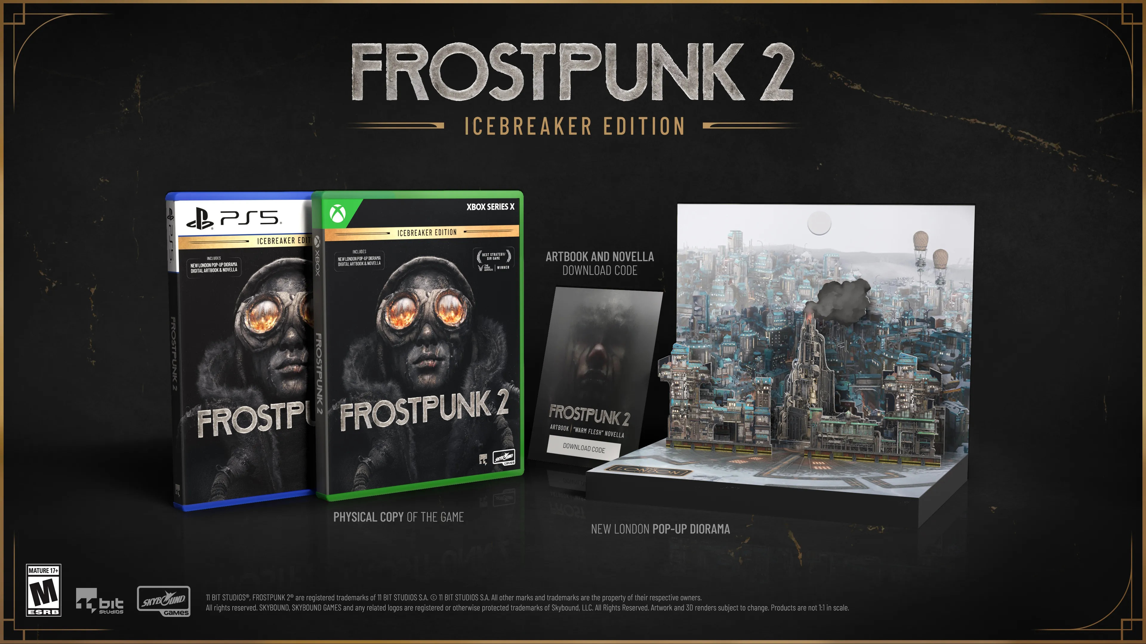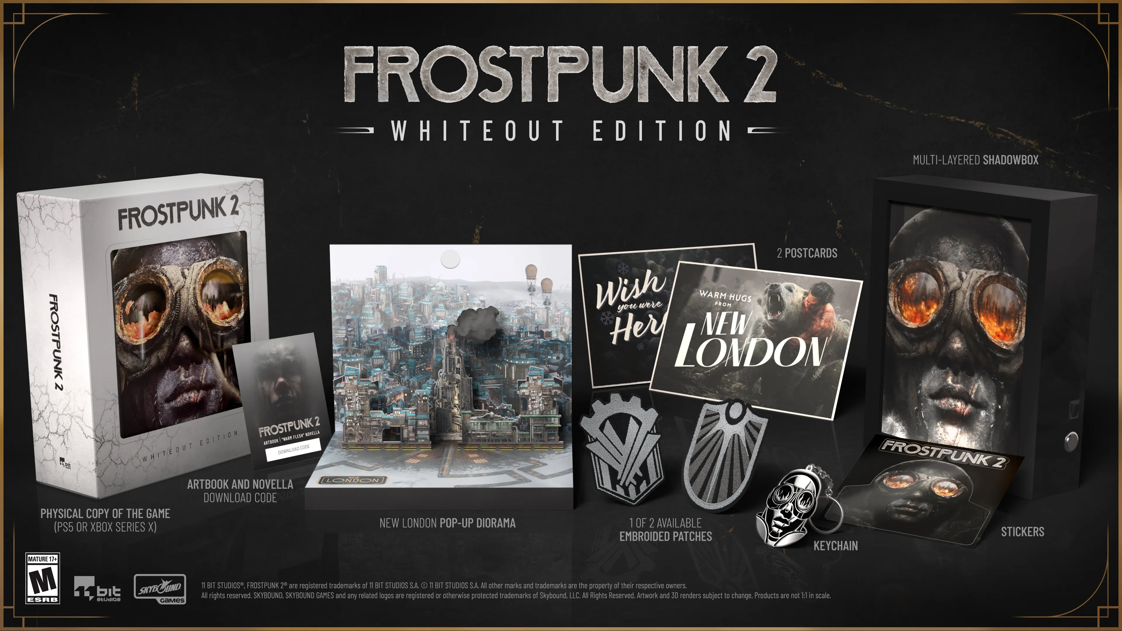 Additionally, 11 Bit Studios partnered with Skybound Games to create two premium physical editions to accompany the digital release. The Icebreaker Edition includes the full game on disc, a pop-up diorama of New London, a digital novella called Warm Flesh, and a digital artbook that chronicles the creation of Frostpunk 2's world. The Whiteout Edition includes all of the Icebreaker Edition content, plus a multi-layered shadow box with integrated LED lighting, a Deluxe Edition upgrade that grants access to three upcoming DLC releases, a metal-and-enamel keychain, two New London art postcards, Frostpunk-themed stickers, and one of two possible embroidered faction patches. The Icebreaker Edition will be $50, while the Whiteout Edition retails for $100.