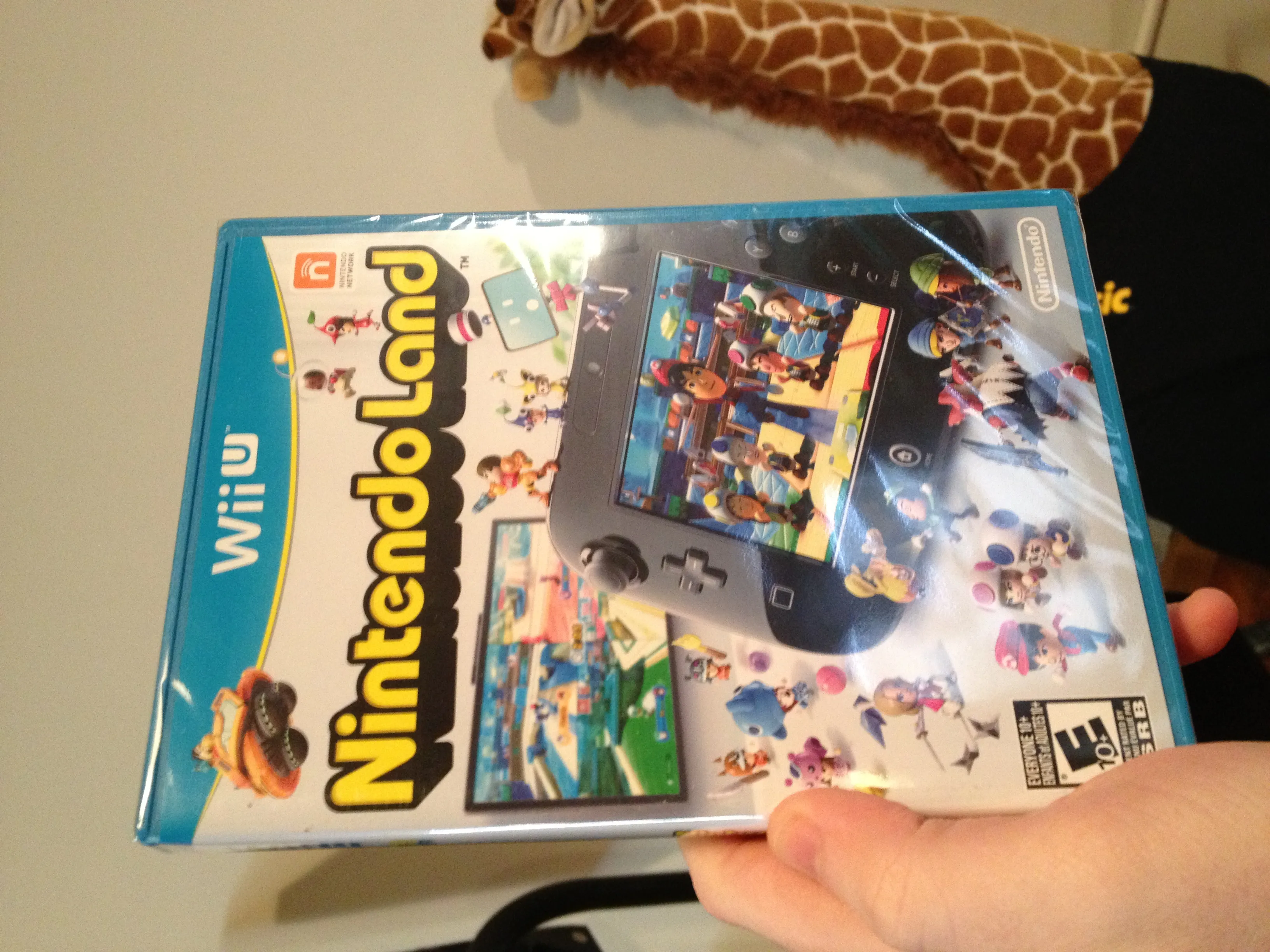 Here's the side of the box that tells you everything that is included. We got one of the fancy deluxe sets. You will also notice that the included Nintendo Land game comes in an actual case, unlike Wii Sports, which just came in a cardboard sleeve. Cardboard may be too friendly. It was more like stiff paper.