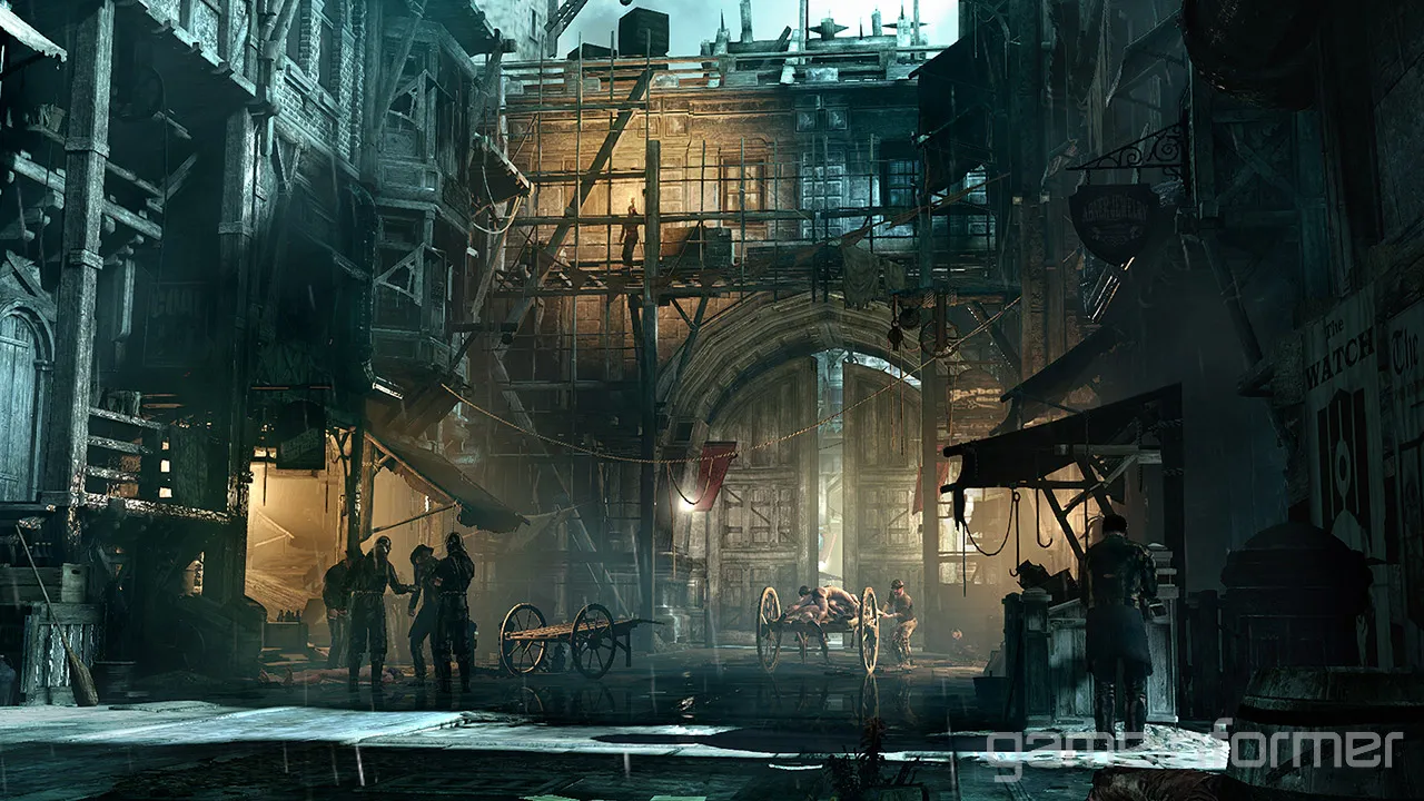 While complete darkness was a big factor in the earlier Thief games, it made it difficult for players to see what was going on. Eidos-Montreal found a key ingredient to help maintain the feel of darkness while adding visibility. "Fog helps us to light the whole game," Cantin says. "If you have a dark scene in a back alley, you just put fog in it and then you see the silhouette. You're never in the pitch dark. The fog is there for the mood but also for helping the player to see."
