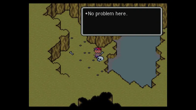 Navigation – Moving through EarthBound’s environment is not fun. The open cities and streets of the towns aren’t bad, but once you get out into the wild, you are constantly getting stuck on edges. When Ness walks too close to an border, he simply stops walking. He stares at you with his tiny pupils and slight smile as if he’s passive aggressively criticizing your ability to control his movement. This is especially frustrating when your health is low and you are trying to outrun a sentient tree.