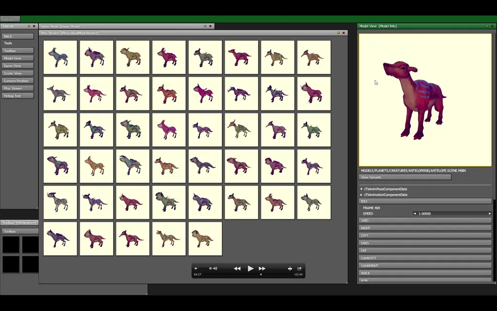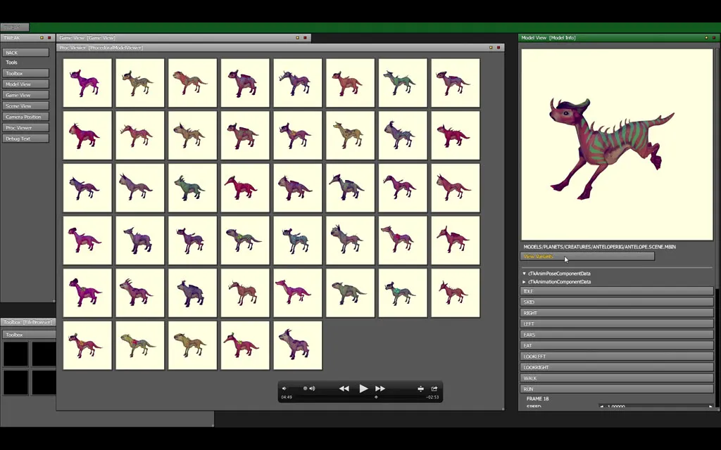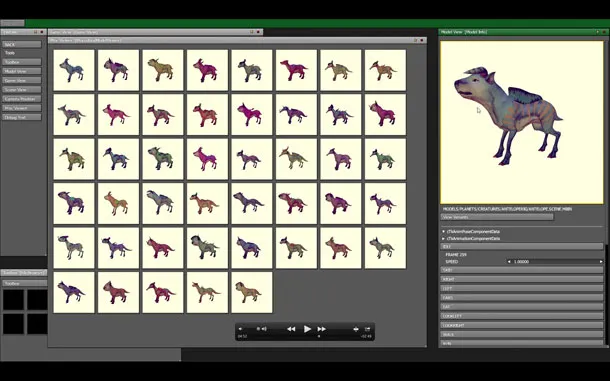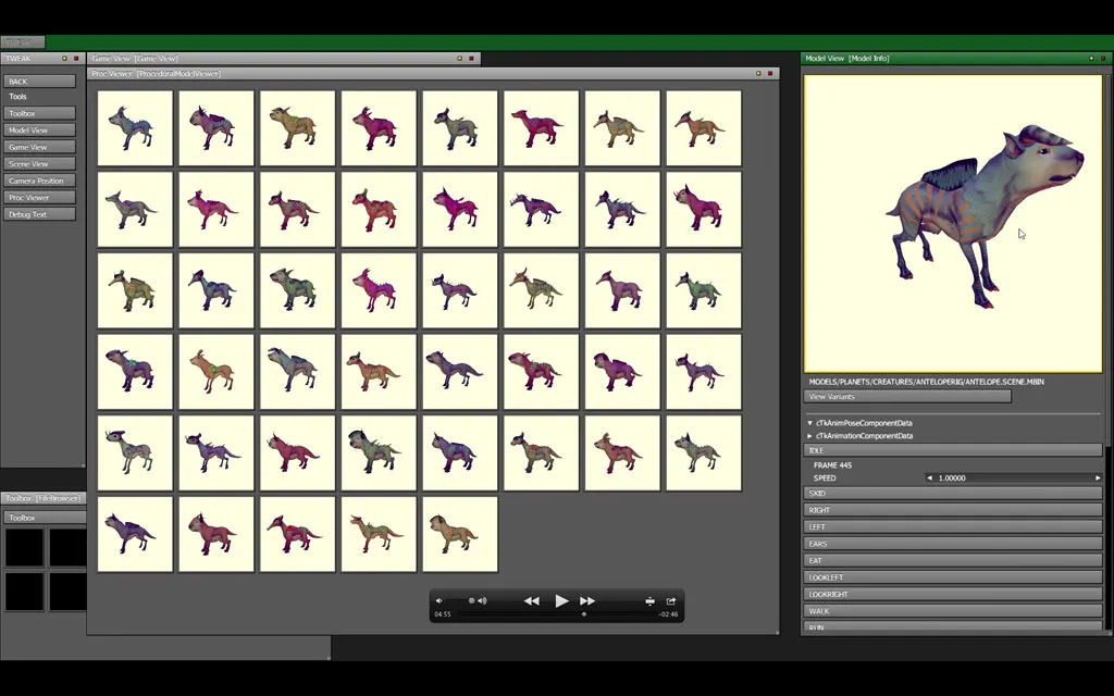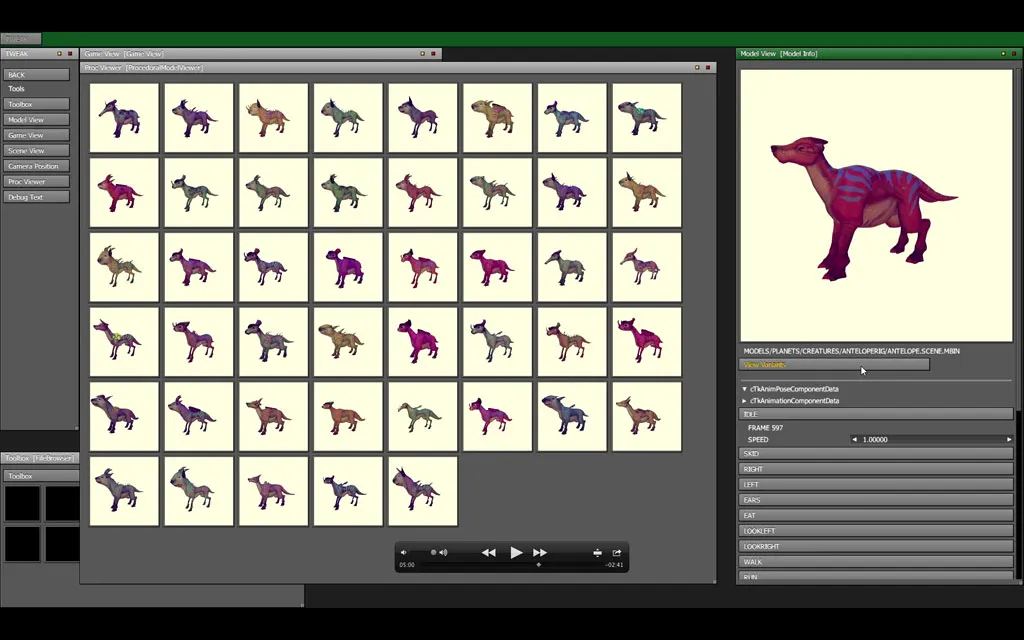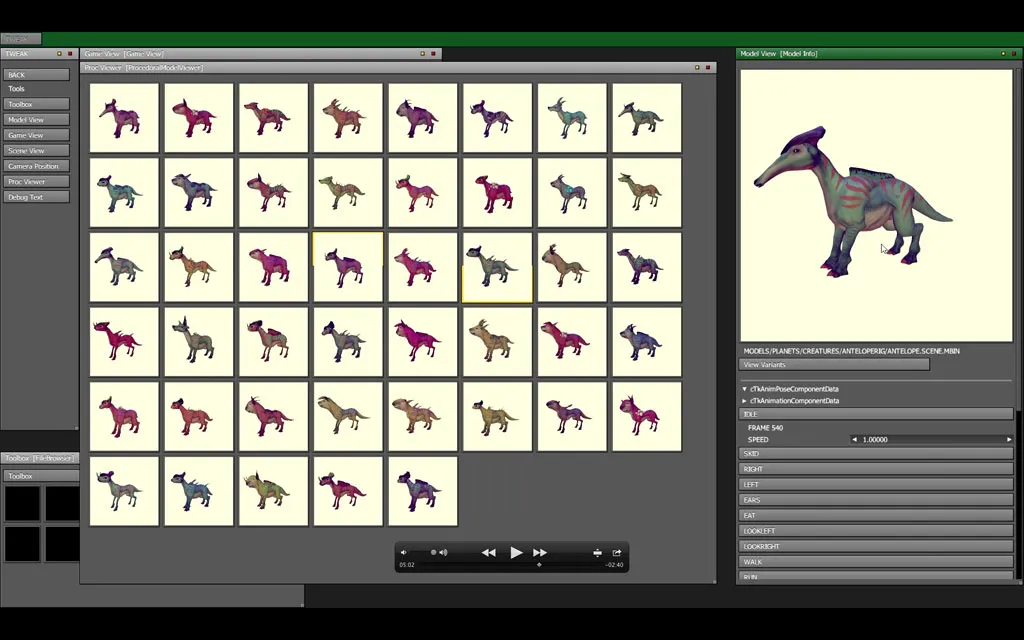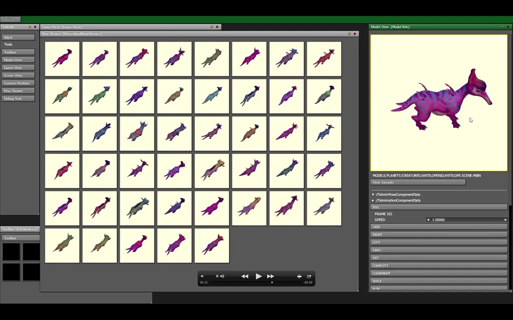 To illustrate, Beau Lamb, one of the game's artists, pulled up an animation of an aquatic creature. The animal in the larger window looked similar to a shark, but a multitude of smaller windows on the screen showed variations based on that template. With the click of a button, the windows refreshed with all-new animals, with different configurations of fins, colors, textures, and more. One had a head like a crocodile, and it looked like something you’d see in a book about prehistoric creatures. Another was colorful and featured a large number of flippers on its sides and belly.