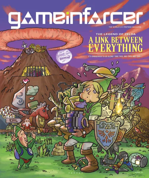 We start with the art by the talented Zander Cannon for our cover game, The Legend of Zelda: A Link Between Everything. We then move on to the blatantly untrue articles, features, and reviews.