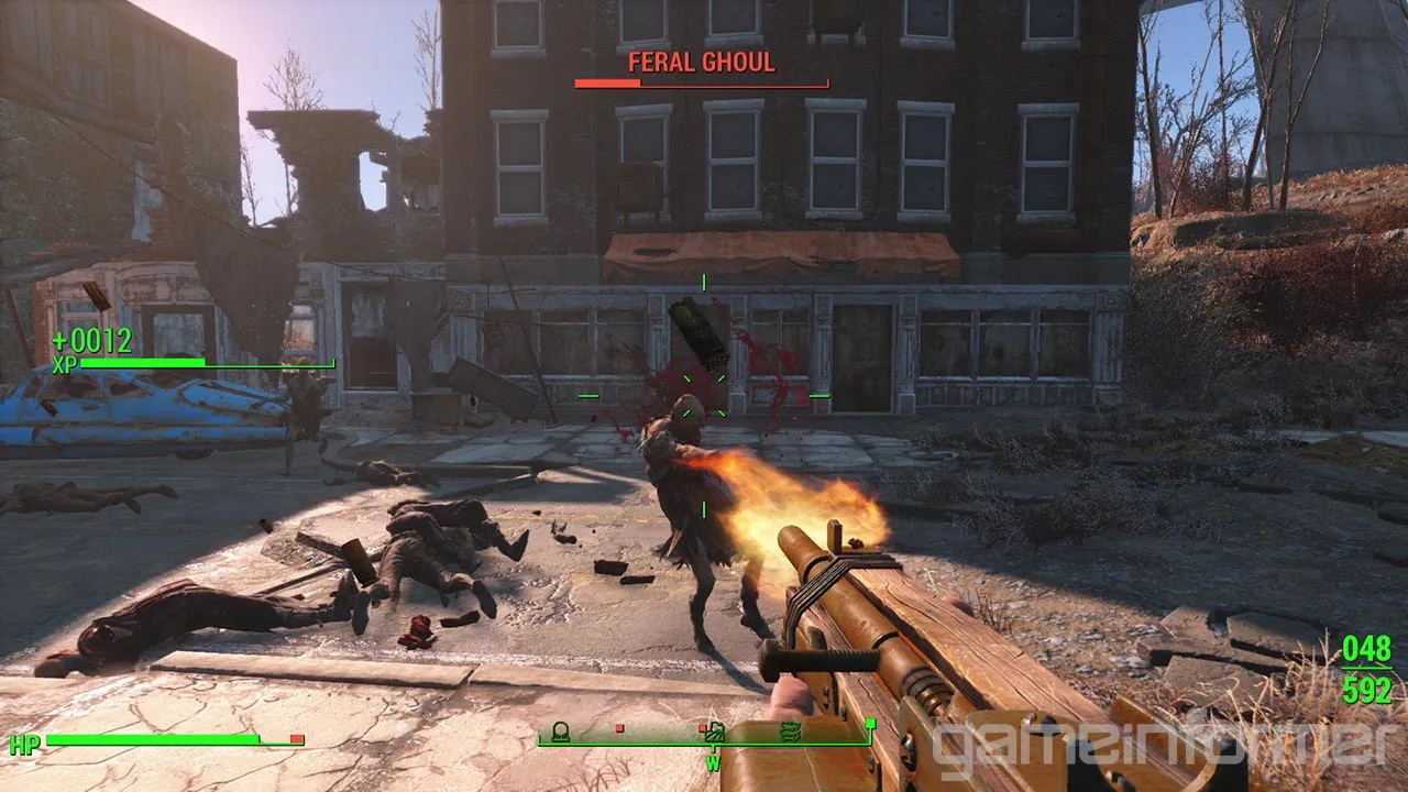 Combat consists of the same choices of running and gunning or tapping into the Vault-Tec Assisted Targeting System (V.A.T.S.) as Fallout 3, but the team hopes that players don’t feel the need to switch between them to make situations easier. Bethesda wants players to play the way they want to. The team knew the gunplay needed to be improved from Fallout 3. To get the correct feel, the developers had to start from scratch. Their goal? Make it feel like Destiny. Bethesda made Destiny a touchstone not just because it liked the feel of the gunplay, but because the game also ran at 30 frames-per-second, just like Fallout 4. The team locked in the frames per second early in development, mostly because 30 allowed for greater density. They wanted players to be able to interact with everything and have it all move dynamically. The gunplay was worked on from day one of the project, and was iterated upon right up until the end. “The main difference in the way we develop [and other studios] is that we will develop with as many knobs as possible,” Howard says. “We’re always thinking of scale. We’re not a team that is just going to make eight guns and spend forever on one gun. We knew we were going to have thousands, so we needed to develop a gun system that had all of the dials.” The team started with one initial gun that could quickly transform into any firearm that would be in the game. One second it could function like a shotgun, the next a sniper rifle. Bethesda’s final touch on improving the gunplay came from recruiting a new team member – Josh Hamrick from Bungie, one of the people who made those guns feel fantastic. He joined the team in April of this year and focused intently on tuning the firearms. |