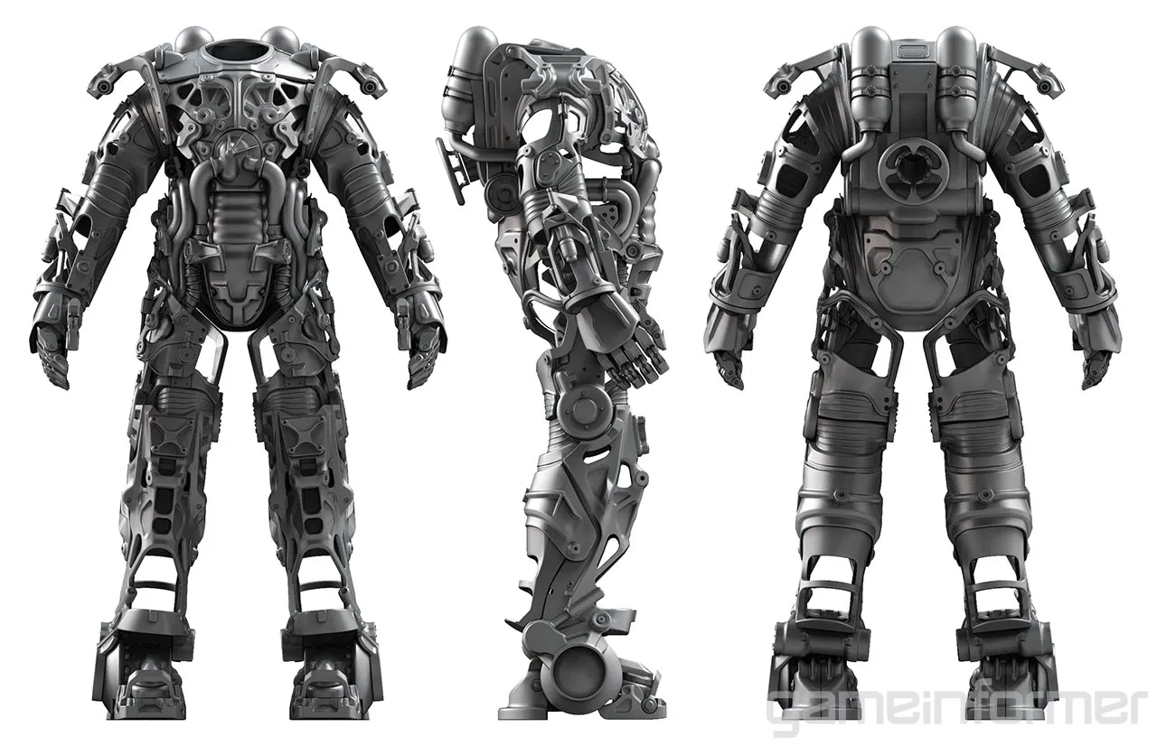 The concept for this new armor design came from discussions Pely had with director Todd Howard and lead designer and writer Emil Pagliarulo. Much like people discussing movies with friends, these conversations were informal, often happening at lunch or as they walked together throughout the office. No one on the team can pinpoint the exact dates when these talks occurred, but Howard recalls they started near the end of Fallout 3.