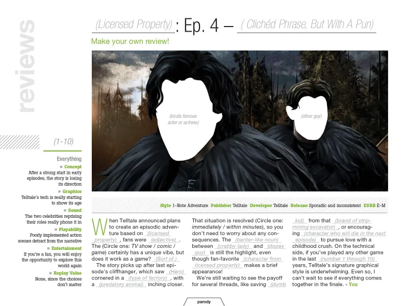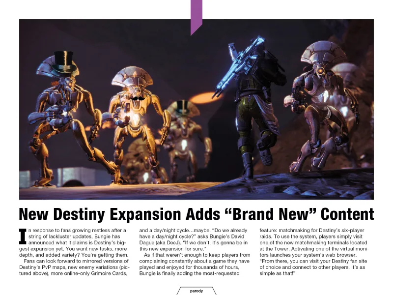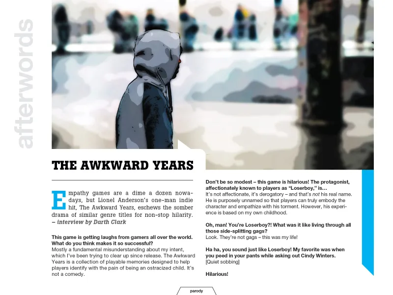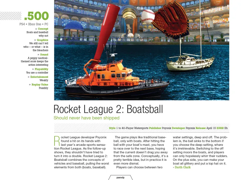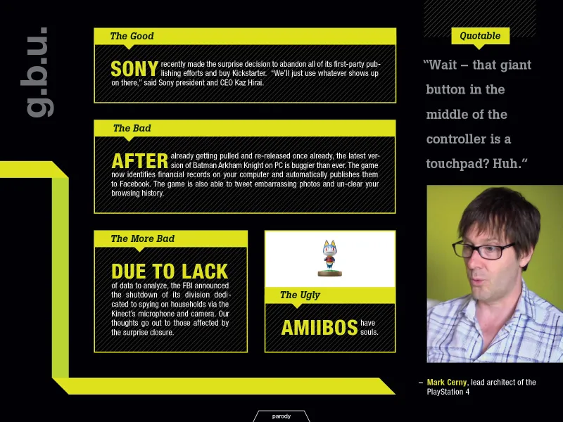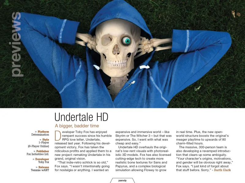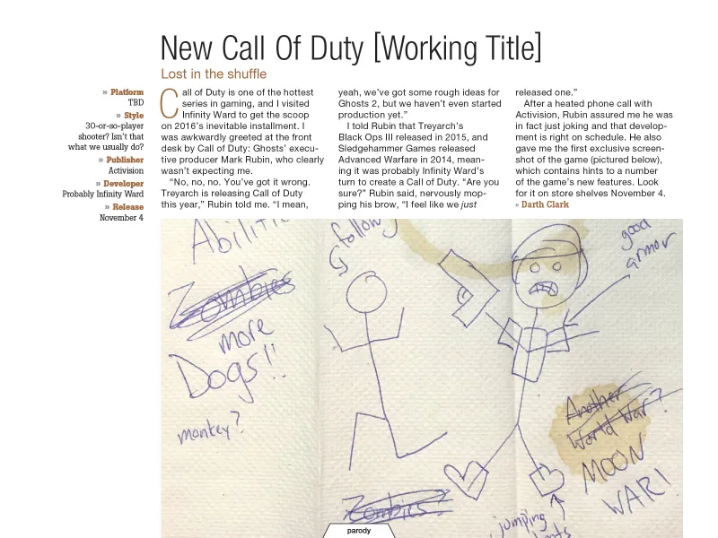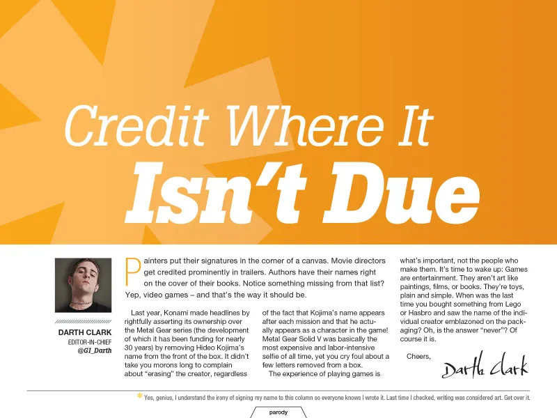 Instead of elaborate pranks, we celebrate April Fools' Day with Game Infarcer, a parody gaming magazine. The feature contains all-fake news, reviews, and interviews; even the editor-in-chief is fake. We include Game Infarcer annually in our April issue, but now you can read this year's edition online.
