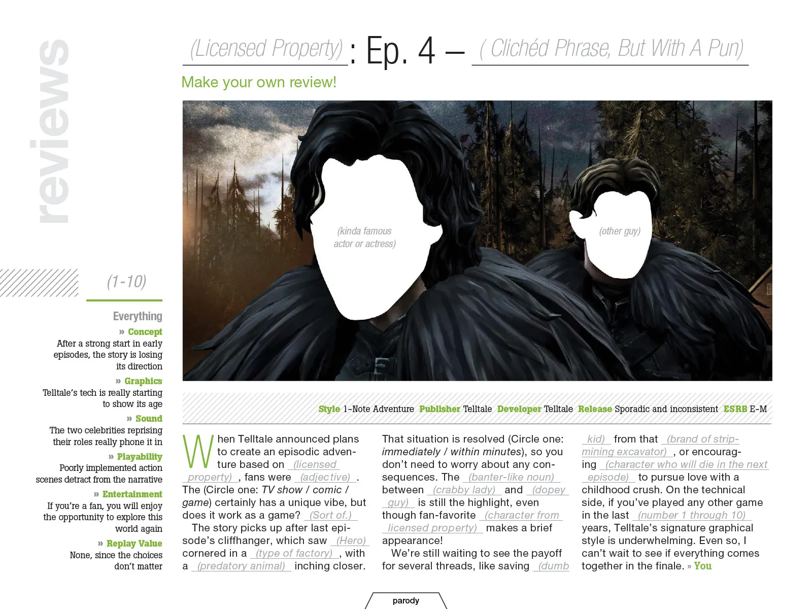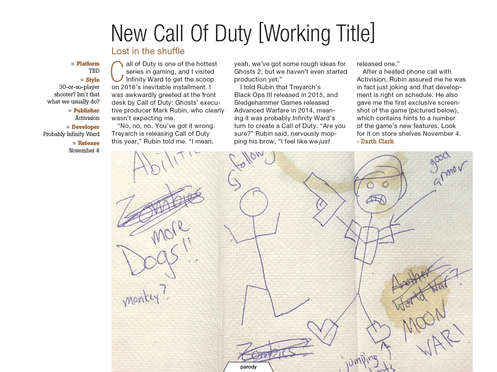 Instead of elaborate pranks, we celebrate April Fools' Day with Game Infarcer, a parody gaming magazine. The feature contains all-fake news, reviews, and interviews; even the editor-in-chief is fake. We include Game Infarcer annually in our April issue, but now you can read this year's edition online.