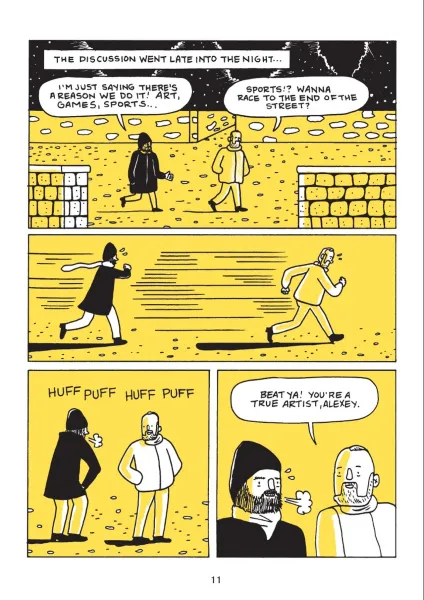 Tetris lacks a lot of character conversation, instead Brown lays out the story’s bullet points in a stylized fashion. “[There were] just so many ins and outs, I thought that spelling those things out simply was important. But it’s fun to kind of add character to the characters, kind of using just visual things,” Brown says, citing Chris Ware’s art style as inspiration. “Because in some ways you’re just kind of organizing information, and being able to spill it out in a visual way that keeps it interesting was totally helpful in this book.”