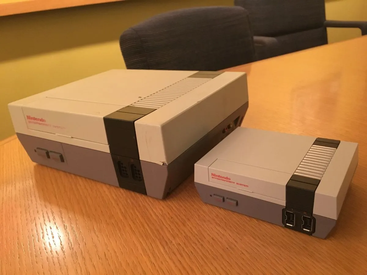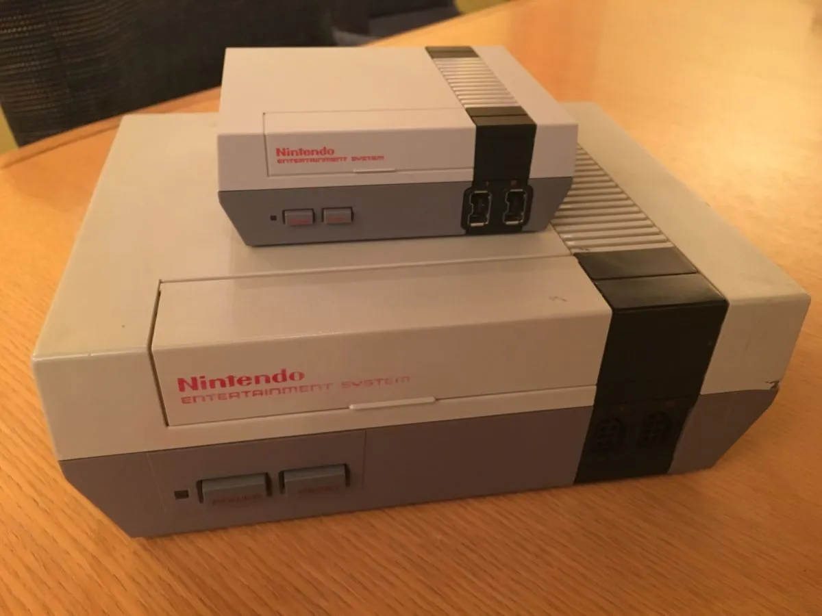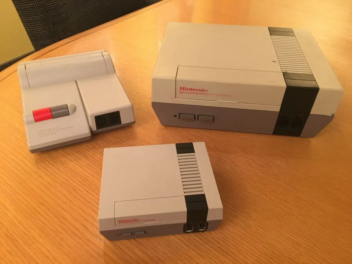 Here's the system placed next to the original NES console, and the redesigned top-loader console.