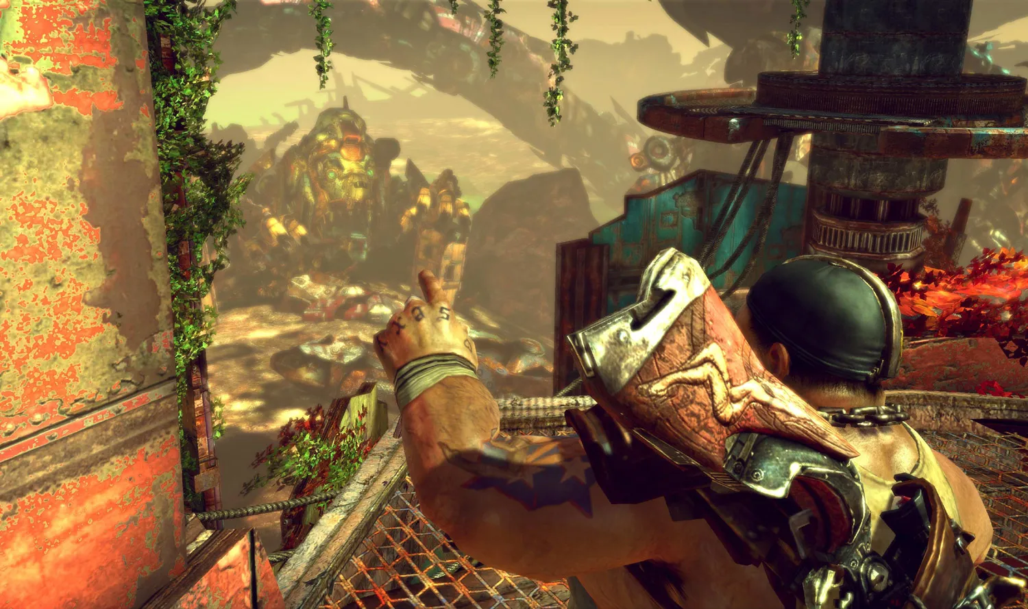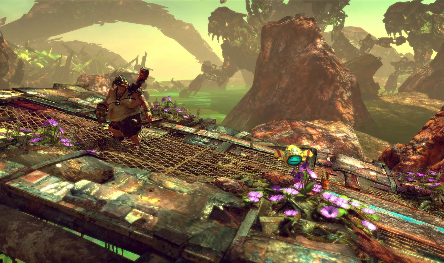 Pigsy’s Perfect 10 will be a side story of sorts, starring Monkey’s memorable ally from Enslaved. In a story that must take place before the events of the game, it seems that the hygiene-challenged Pigsy has grown tired of his solitude and decided to create his own perfect woman out of the scrap found around his hovel in the Titan Graveyard. In contrast to Enslaved gameplay, Pigsy’s Perfect 10 will focus on stealth and sharp-shooting. Not only will players finally get to test out Pigsy’s hookshot for themselves, but they’ll get to play with a new friend, Pigsy’s robotic pal, Truffles.
