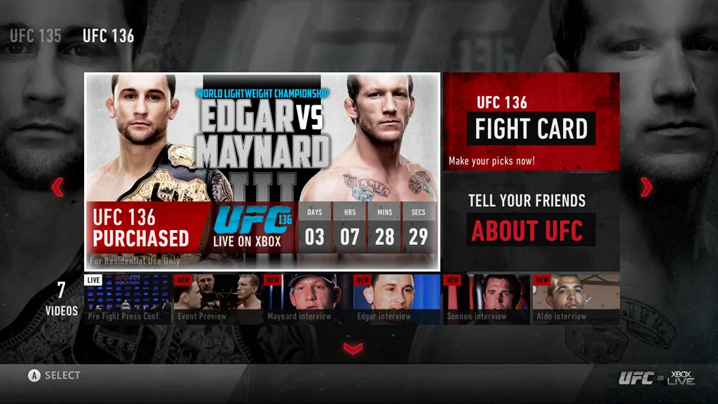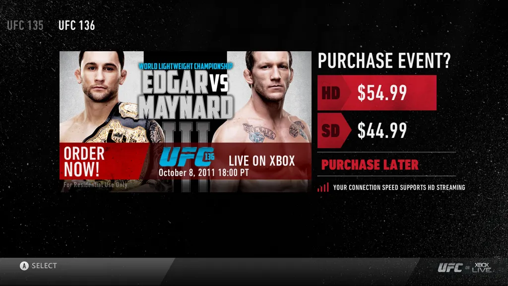 In addition to getting HD streams of the events, viewers who watch UFC matches on the Xbox 360 will have several interactive options available as well. These include event previews, press conferences and weigh-ins, interviews, and other pre-match goodies. Once the bell rings, viewers can predict the winners and see how those hunches fare in online leaderboards. Players can take control of all of this using either their controller or through Kinect's motion interface. The service will begin December 1.