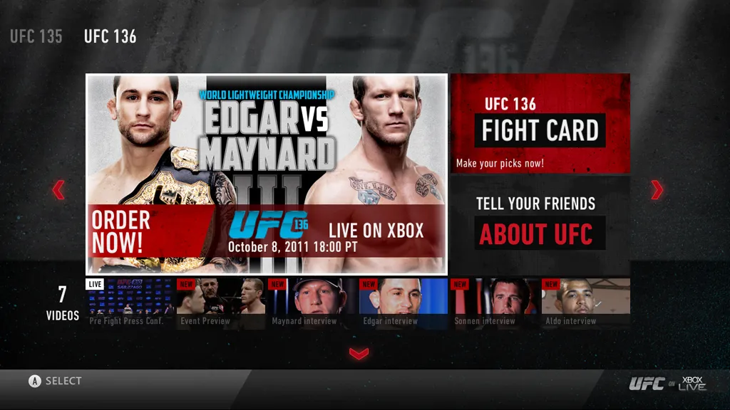 Microsoft has been positioning the Xbox 360 as a media hub for quite some time now, and today's batch of screens certainly reinforces that intention. As the company announced at E3, UFC matches will soon be available for live viewing on the console. These new screens show off some of the functionality that Microsoft hopes will entice viewers to reach for their controller instead of their cable box the next time a big pay-per-view match comes along.