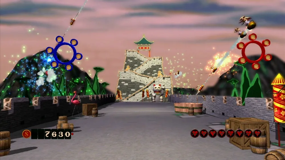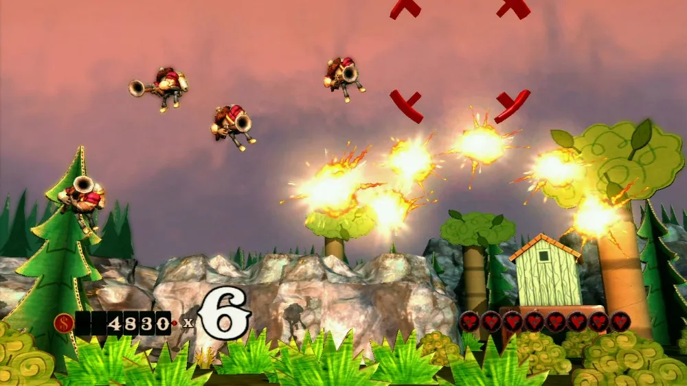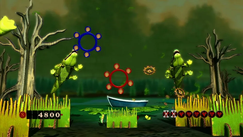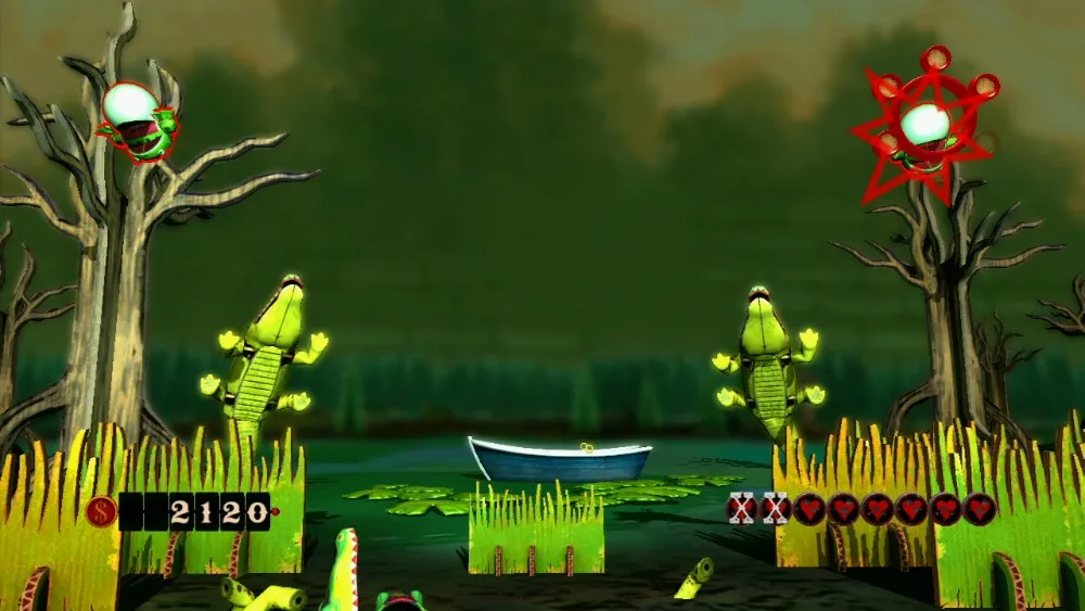 Each round is far more challenging and fast-paced than any of the gameplay in the core experience, usually consisting of waves that require all six bullets to be locked on and fired as quickly as possible. A combat modifier is randomly selected at the beginning of each round. If the “shotgun” mod is in play, the round will be much easier, as you can blast multiple enemies at once without having to tag them first. If the “metal” mod is in play (requiring all enemies to be shot twice), the round could become unbearably difficult. I rage quit on my first playthrough when it appeared on the fifth round, making the frog and alligator foes unfairly difficult. Even after memorizing the waves of foes, I still couldn’t complete this round.