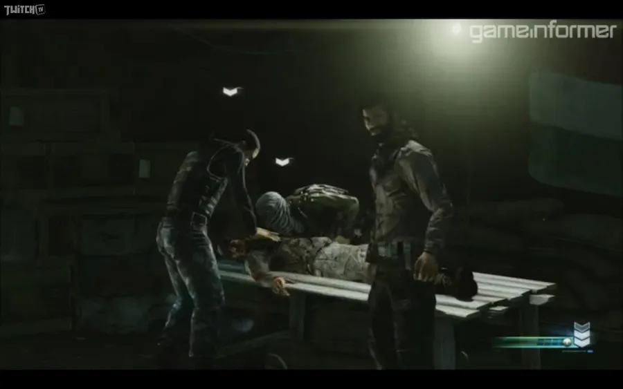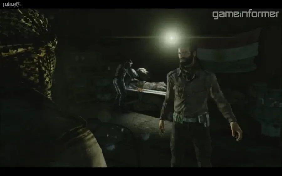 The demo starts with a man dressed in Middle Eastern garb carrying a wounded man towards a checkpoint. He calls out to the wary soldiers, who direct him towards a tent. Once inside, the good samaritan drops the body on the floor and silently dispatches everyone in the tent. He then drops his outer garments to reveal his true identity as UbiSoft’s longtime stealth expert, Sam Fisher.