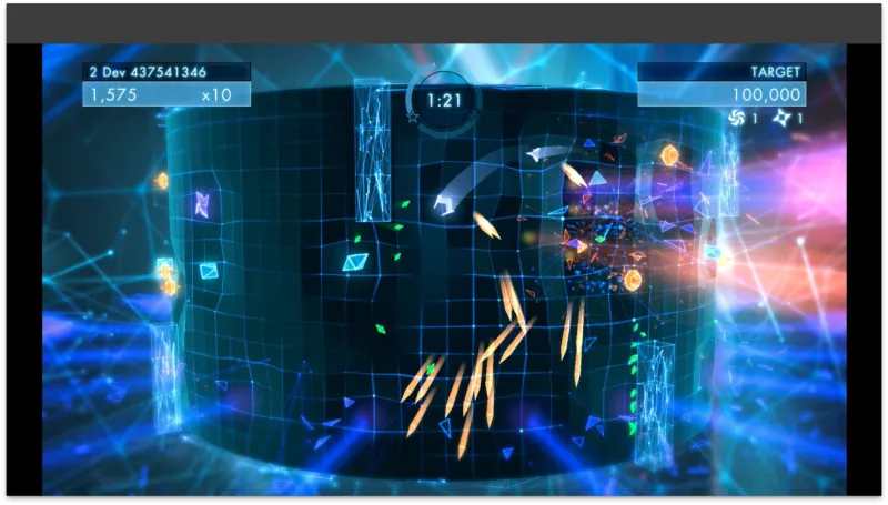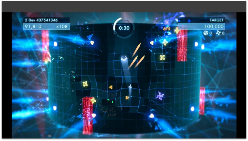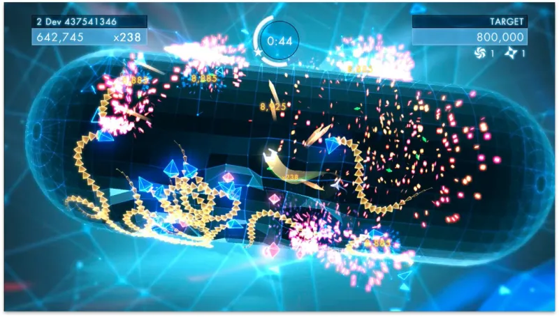 Our demo was an extended look at the single-player content, across multiple geometric shapes (spheres, cylinders, cubes, and a peanut) blasting enemies and building a multiplier for killer scores. After our last demo, many readers were curious about the two-dimensional play of the first two titles.