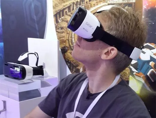 The Gear VR is an add-on for the newly announced Samsung Note 4 phone, which has a 5.7 inch Quad HD Super AMOLED display. The device is attached to the head mount. The Gear VR uses the hardware in the phone, so there are no tether cables.