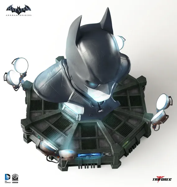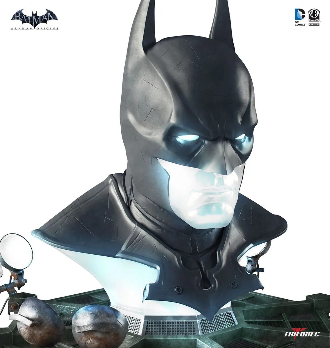 The Batman: Arkham Origins cowl replica is considered full scale, with the entire statue (including base) measuring 26 inches by 23.5 inches by 24.5 inches. The LED lights on the mounting are designed to mimic elements found in the Batcave.
