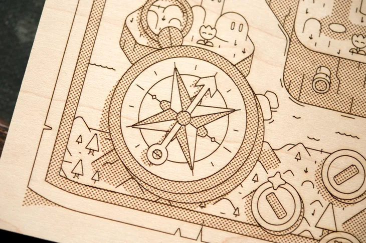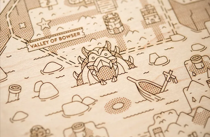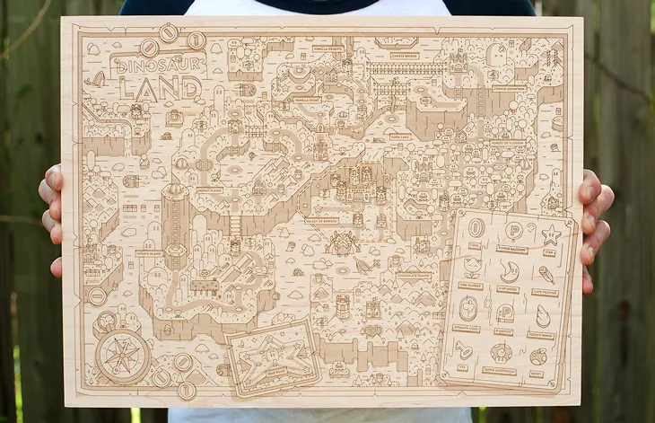 Last year, we featured Alex Griendling’s spectacular map of Hyrule. What drew our eye is that each map is laser-etched onto hand-selected wood. His latest work takes us from Hyrule to a far-off island in the Mushroom Kingdom.