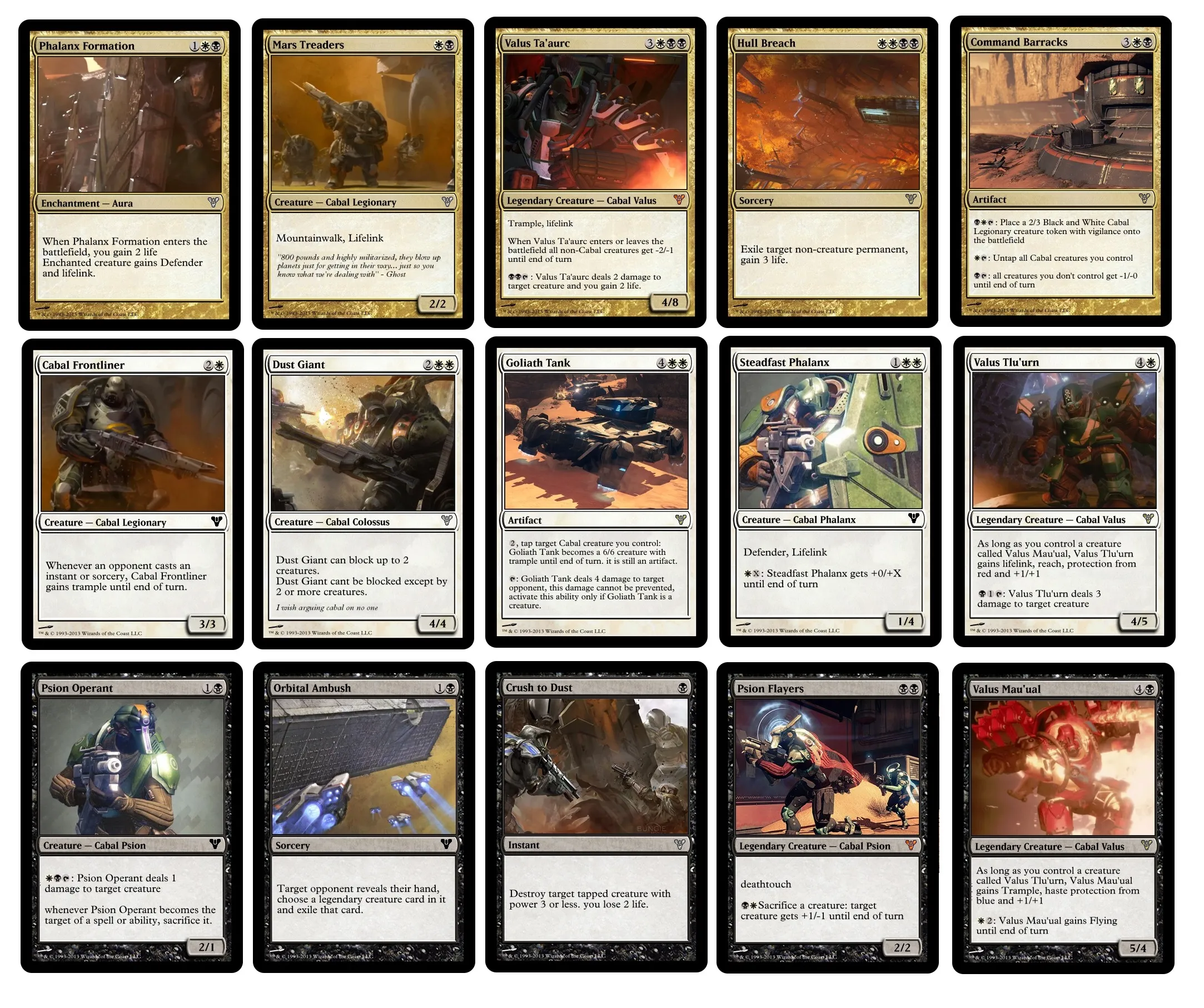 The set of cards, first posted by Imgur user “brootalcore1,” shows off each faction in Destiny, each crafted to fit the typical Magic the Gathering color scheme familiar to series fans. The Fallen inhabit the aggressive red and the orderly white. The Cabal, the immense warmongering species reminiscent of Halo’s Brutes, inhabit red, white, and the power-hungry black.